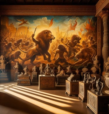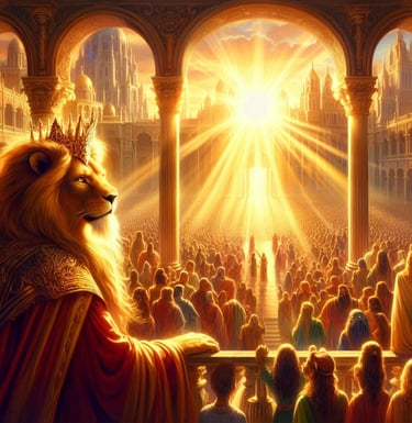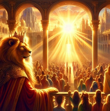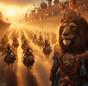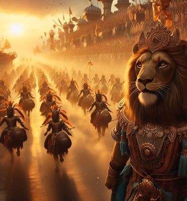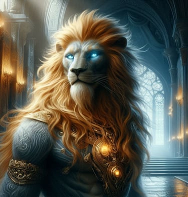 The current ruler of this awe-inspiring kingdom is King Manus, a figure who perfectly embodies the unique blend of power, wisdom, and forward-thinking leadership that defines Drakoria. As a mystical creature of the Simha Clan, with the majestic form of half man and half lion, King Manus commands respect not only through his imposing presence but also through his sagacious demeanor. His aura radiates wisdom and power, qualities sharpened by centuries of his ancestors' dedicated service. His lineage is indeed legendary; his forefathers bravely fought alongside the gods Aether and Fortitudus and the valiant Panthera clan in the first Battle of Luminalis, a pivotal moment in Harmonya's history.