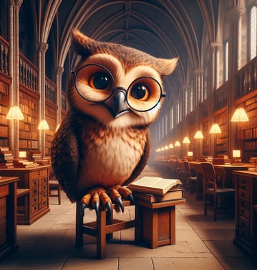 Presiding over this unparalleled treasury of knowledge is a librarian unlike any other: the magnificent giant owl Archimedes. With feathers that twinkle like stardust and magnified spectacles perched upon his beak, Archimedes is an ancient sage of profound understanding. He has witnessed the rise and fall of empires, the secrets of the universe, and the forgotten tales of mythical beings. Despite his imposing size, Archimedes possesses a gentle demeanor, embodying both wisdom and warmth as he guides visitors through the library's vast halls. He knows each and every book, and his piercing amber eyes reflect centuries of insight. He can even discern a visitor's needs before they ask, offering the exact book they seek. His presence alone is a testament to the timeless wisdom safeguarded within Novus.